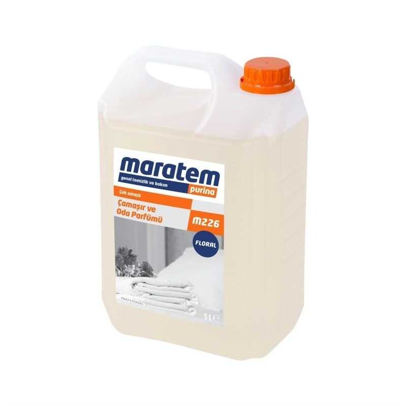 Maratem M226 Çamaşır & Oda Parfümü Floral 5 L – tekstil ve oda kullanımına uygun, kalıcı çiçeksi koku bırakır ve kötü kokuları giderir. Profesyonel ve yoğun kullanımlar için ideal.
