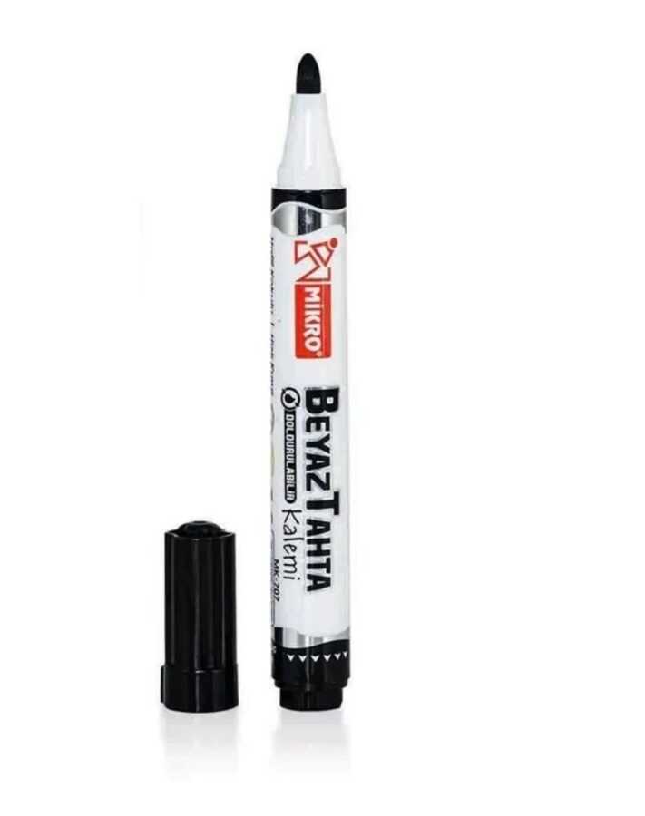 Mikro MK-707 Doldurulabilir Beyaz Tahta Kalemi, uzun ömürlü kullanımı ile öne çıkan, yoğun siyah mürekkebi sayesinde beyaz tahtalarda yüksek görünürlük sağlayan pratik bir yazım aracıdır. Doldurulabilir yapısı sayesinde ekonomik bir kullanım sunar ve kurumaya karşı dayanıklıdır.