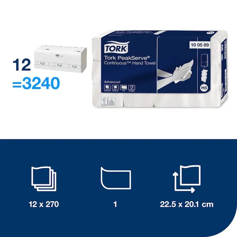 Tork Peakserve™ Continuous Kağıt Havlu, yüksek yoğunluklu alanlarda operasyonel verimliliği artırmak için geliştirilmiş yenilikçi bir sistemdir. Dispenser ile tam uyumlu yapısı, çalışanların zamandan tasarruf etmesini ve kullanıcıların kesintisiz hizmet almasını sağlar. Sıkıştırılmış ambalajı sayesinde depolama alanı ihtiyacını da minimuma indirir.